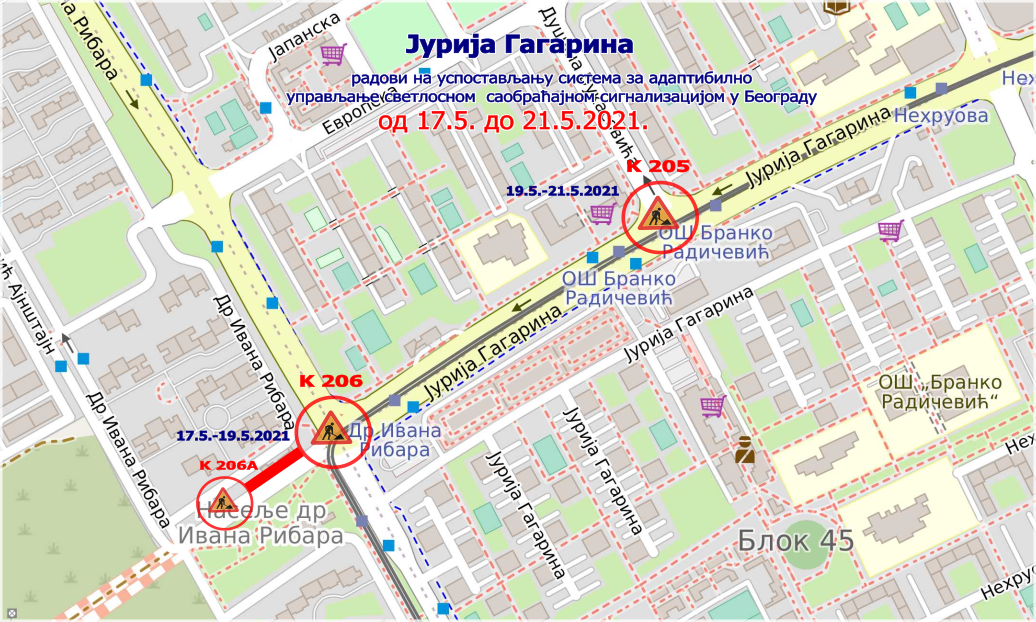- у периоду од 17.05 до 19.05.2021. године, радови под саобраћајем обављаће се на раскрсници улица Јурија Гагарина и Др Ивана Рибара (К206), као и на пешачком прелазу код блока 72 (К202А),