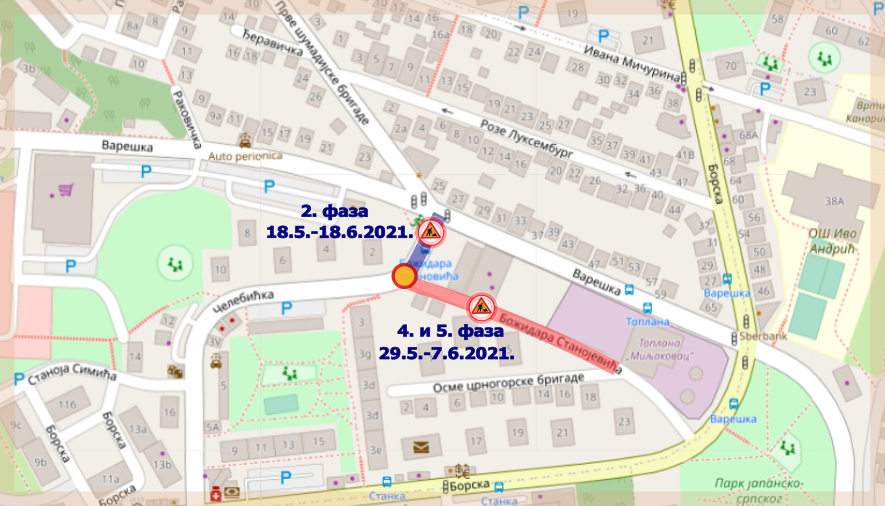 - током 4. и 5. фазе радова у периоду од 29.5. до 7.6.2021.године у улици Божидара Стојановића од Челебићке до Осме црногорске бригаде.