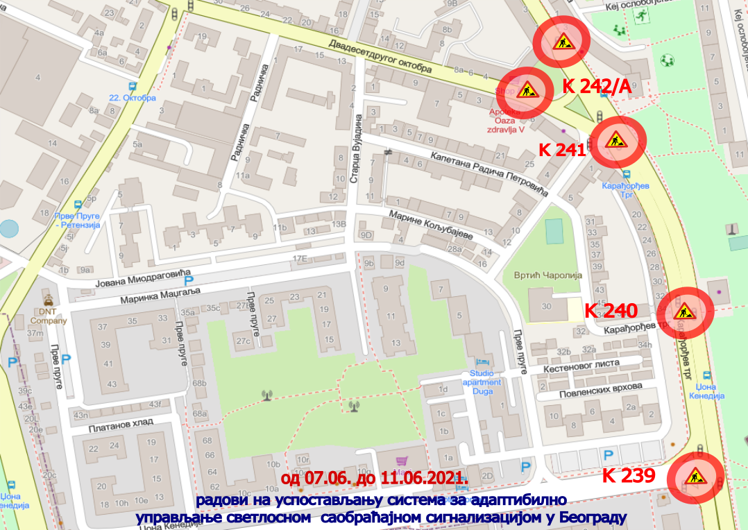 - у периоду од 07.06. до 09.06.2021. године радови под саобраћајем обављаће се на раскрсници Карађорђева - пешачки прелаз (код броја 3) (К242) и 22.октобра- пешачки прелаз (К242А)