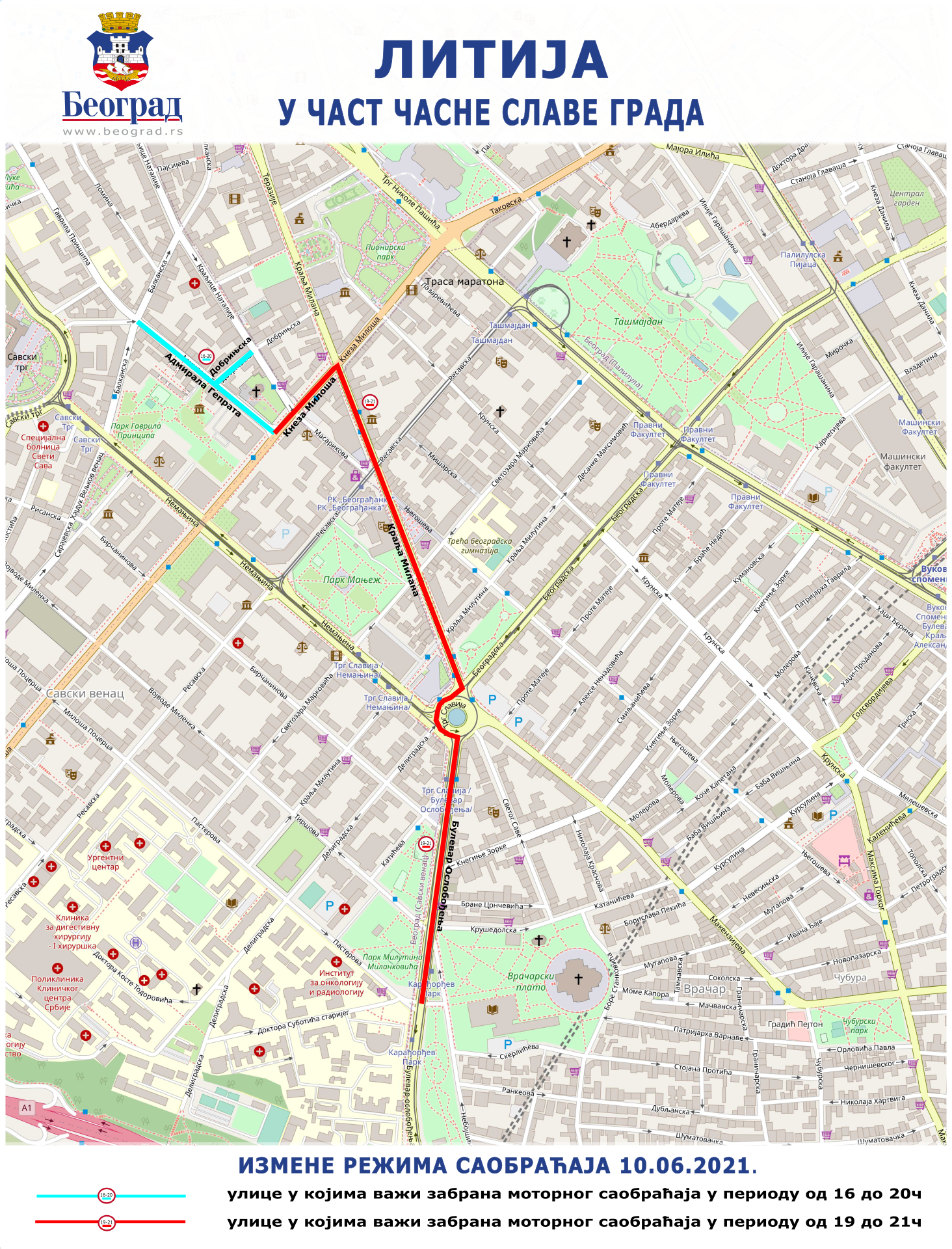 У периоду од 19 до 21 часова за саобраћај ће бити затворене улице којима литија пролази и то: Адмирала Гепрата – Кнеза Милоша (од Адмирала Гепрата до Краља Милана) – Улица краља Милана (заустављање од пет до десет минута на Тргу Славија) – Булевар ослобођења до Храма Светог Саве.