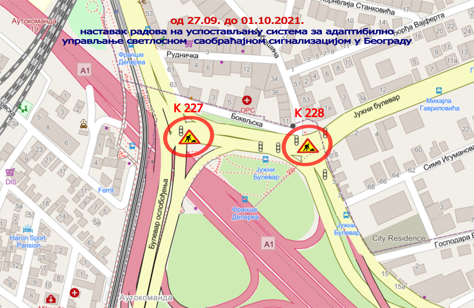 - у периоду од 27.09. до 29.09. на раскрсници улица Устаничка - Јужни булевар - Бокељска (К228)