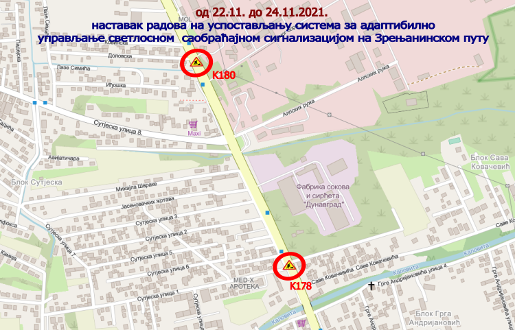 - од 22.11. до 24.11.2021. год. раскрсница Зрењанински пут - Сутјеска 1 - Саве Ковачевића 1 (К 178)