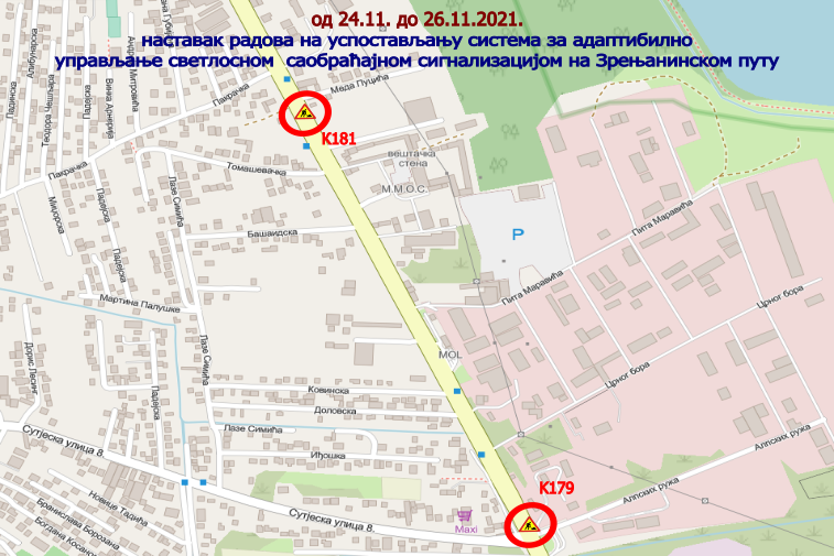 - од 22.11. до 24.11.2021. год. раскрсница Зрењанински пут - пешачки прелаз у зони Доловске улице (К 180)