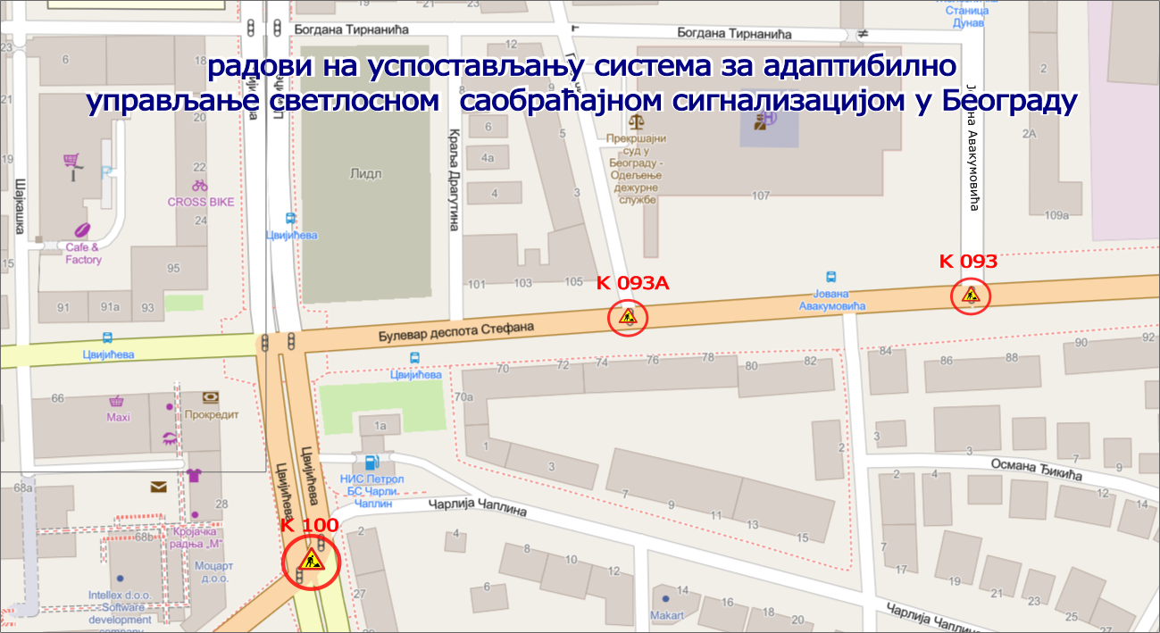 Секретаријат за саобраћај обавештава грађане да ће у периоду од 21.03. до 25.03.2022. године доћи до наставка радова на изградњи Система за адаптибилно управљање светлосном саобраћајном сигнализацијом у улици Булевар деспота Стефана и Цвијићевој.