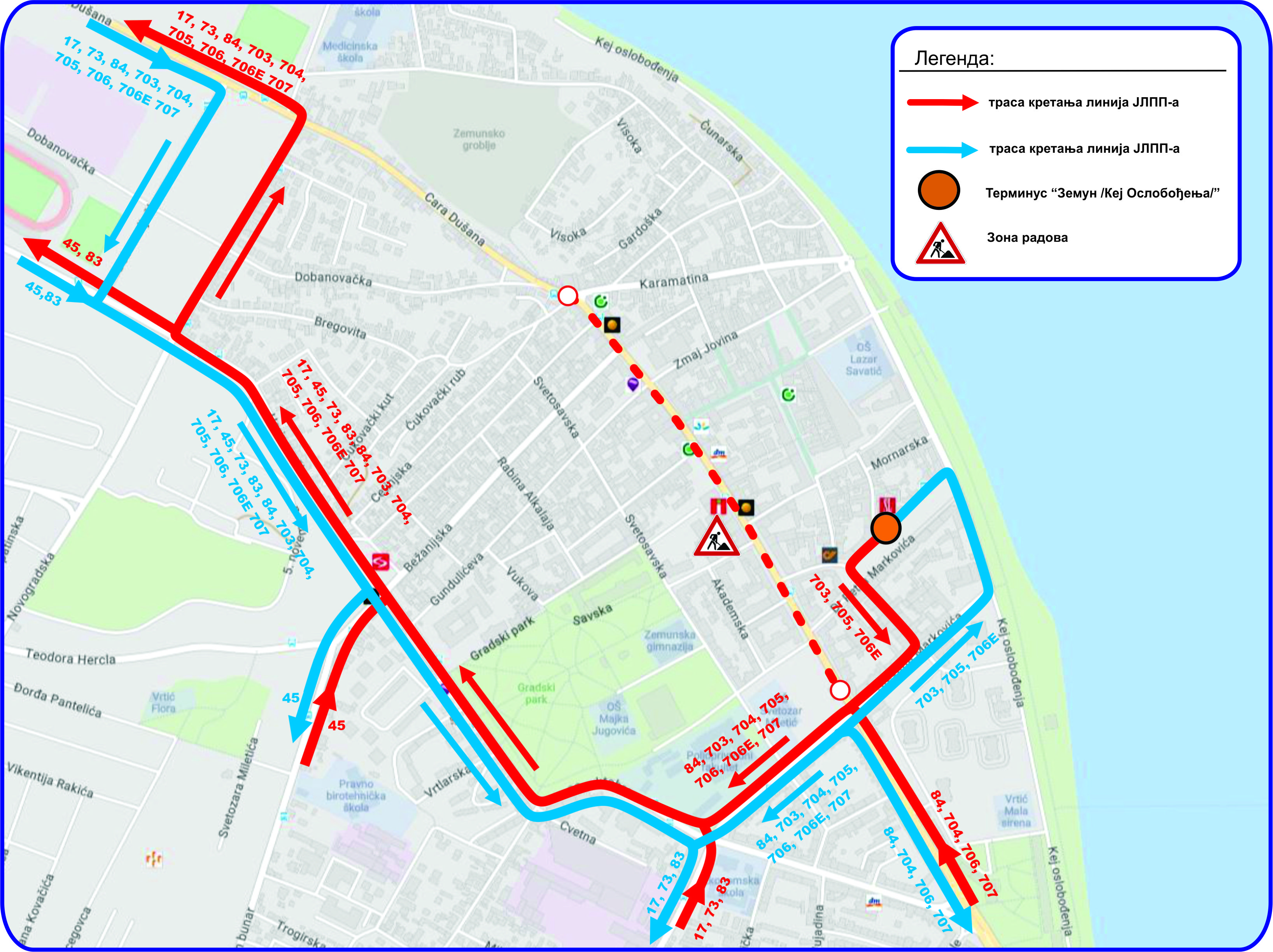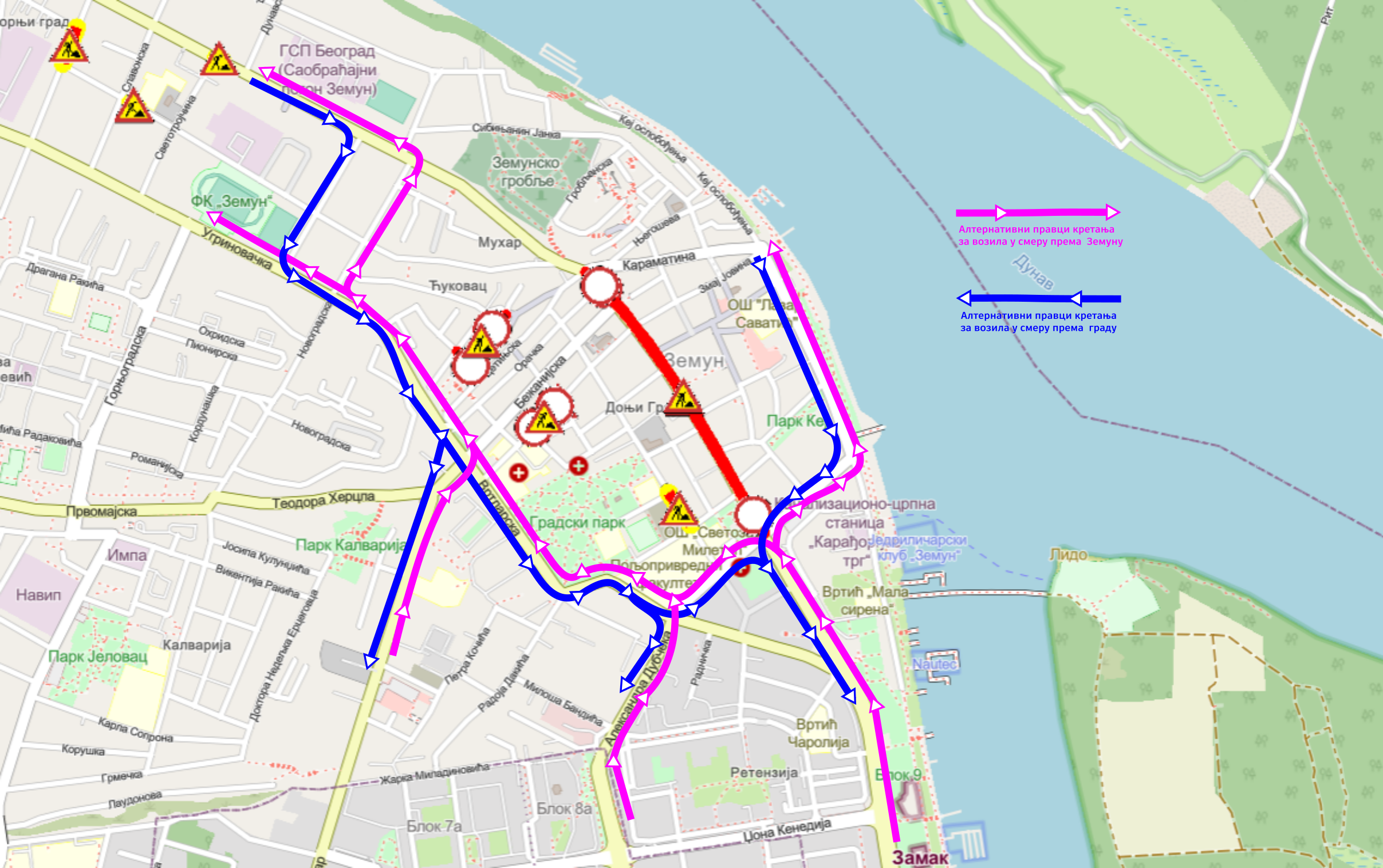 Током радова на реконструкцији улице Главне у Земуну, у постојећој регулацији, у складу са фактичким стањем на терену, које изводи Град Београд, за потребе Секретаријата за инвестиције, „Електродистрибуција Србије“ д.о.о., и „Телеком Србија“ а.д., биће обустављен саобраћај у раскрсници улица Трг Бранка Радичевића - Главна - Караматина – Василија Василијевића, у ул. Главној и у ул. Авијатичарски трг од ул. Главне до раскрснице са улицама Карађорђева – Стевана Марковића, у периоду од 23.09.2023. до 08.10.2023. године.