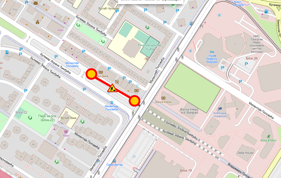 Током радова на одржавању улица и путева, које изводи ЈКП "Београд пут", биће обустављен саобраћај у једној коловозној траци, заузет коловоз у Булевару Зорана Ђинђића од ул. Милентија Поповића до ул. Антифашистичке борбе, смер ка ул. Антифашистичке борбе, у периоду од 16.10.2023. до 19.10.2023. године.