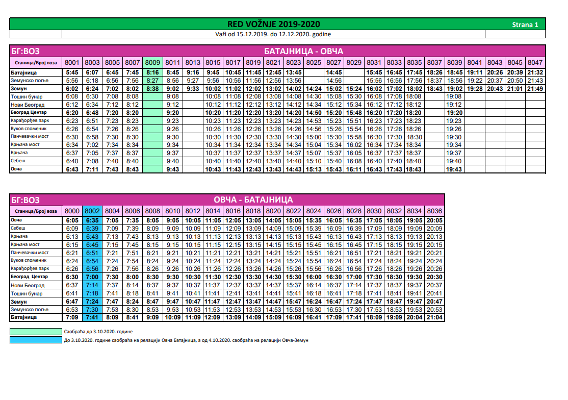 Ред вожње БГ ВОЗ линије на релацији Батајница - Овча и Овча - Батајница