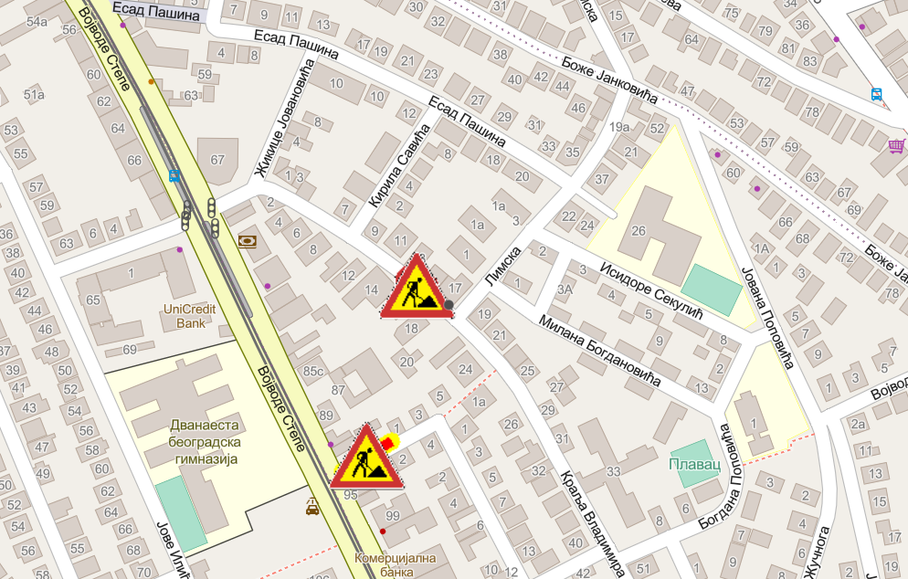 - I фаза – биће заузет део тротоара и део коловоза у улици Краља Владимира испред броја 16, у временском периоду од 26.03.2021. до 14.05.2021. године (уторком и петком).