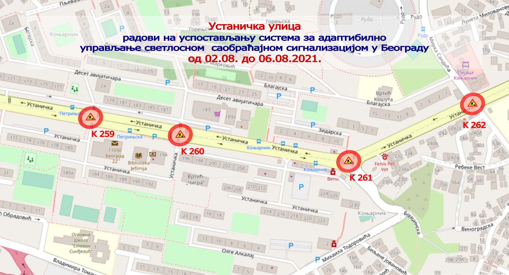 - од 04.08. до 06.08.2021. године на раскрсници Устаничка - тржни центар Коњарник (К060), на раскрсници улица Устаничка - 10 авијатичара (К059).