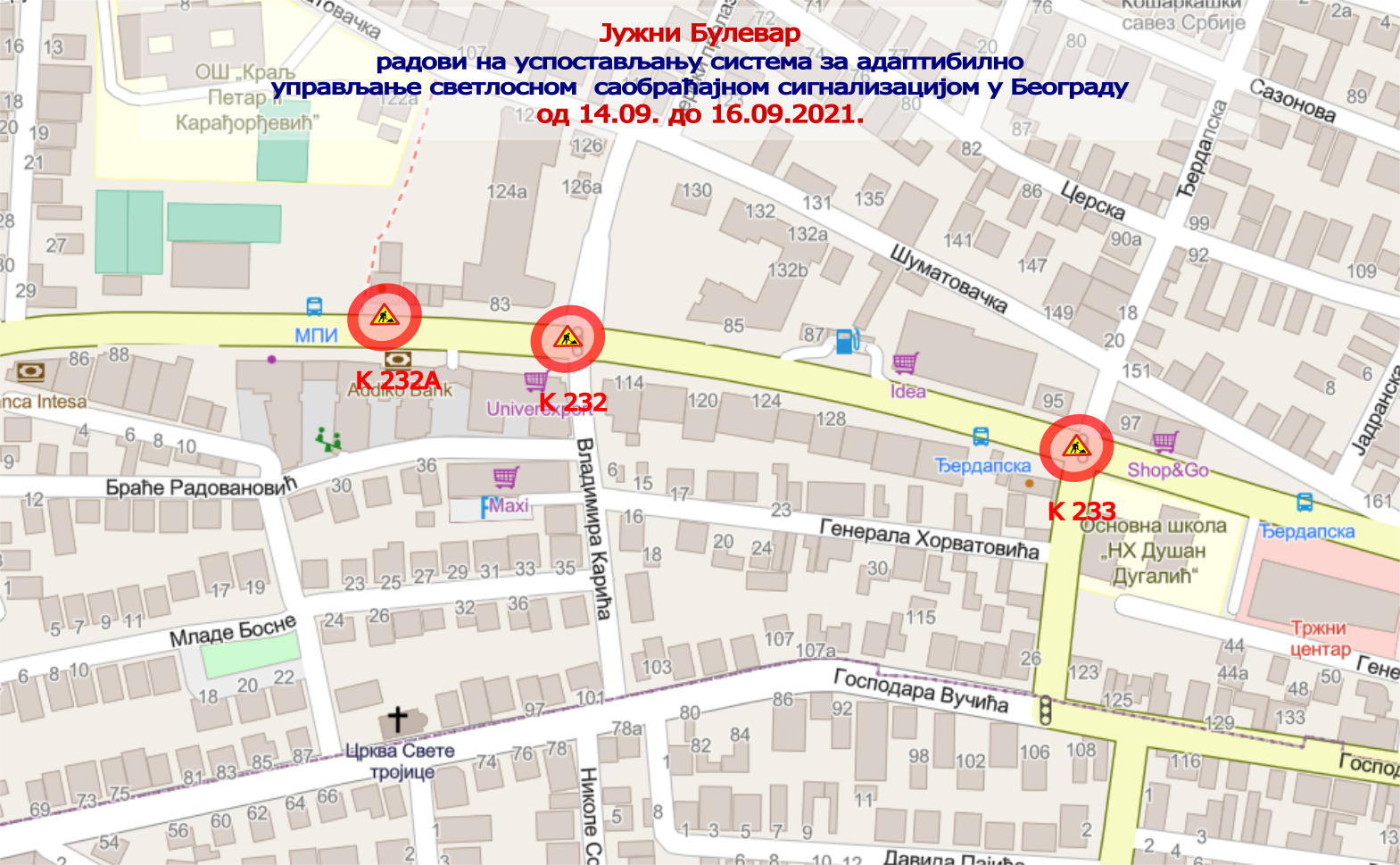 Секретаријат за саобраћај обавештава грађане да ће у периоду од 14.09. до 16.09.2021. године доћи до наставка радова на изградњи Система за адаптибилно управљање светлосном саобраћајном сигнализацијом у Београду, у улици Јужни Булевар.