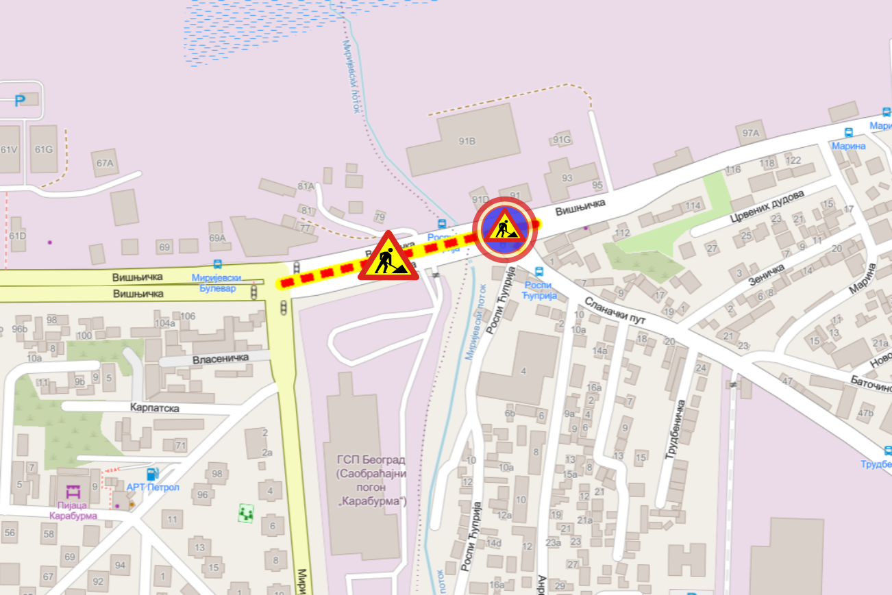 Током извођења радова на редовном одржавању улица и општинских путева на територији града Београда, које изводи ЈКП "Београд пут", биће измењен режим саобраћаја у улици Вишњичкој на расксници са Сланачким путем у периоду од 28.06.2023. до 30.06.2023. године.