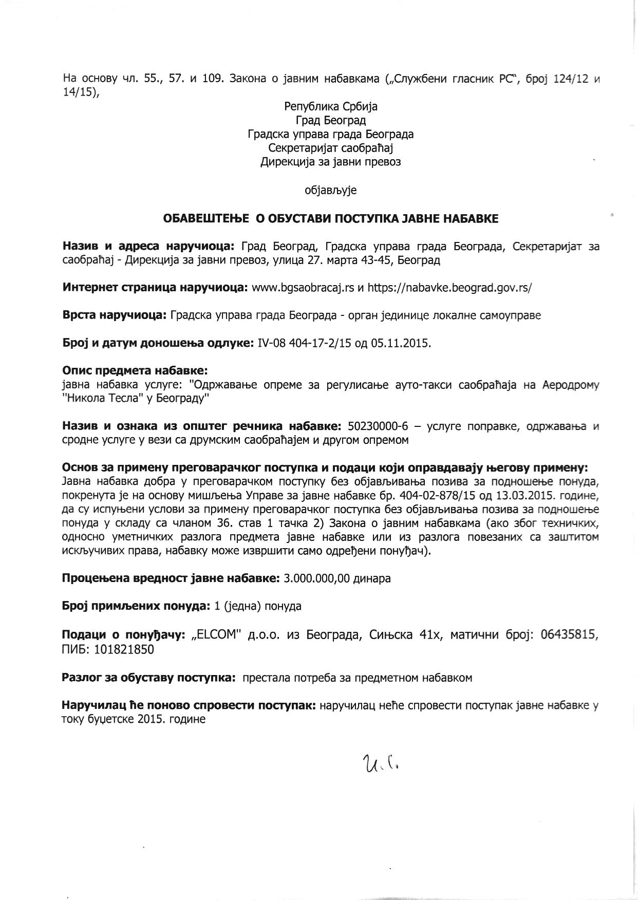 Јавна набавка 11/15 - Услуга ''Одржавање опреме за регулисање ауто-такси саобраћаја на Аеродрому ''Никола Тесла'' у Београду''